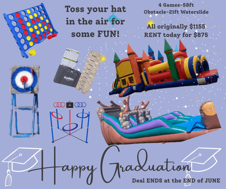 Celebrate with the best equipment and games. Our Graduation game/inflatable package delivers a huge obstacle, a 21ft waterslide, and four high-energy games that keep guests laughing and competing. Perfect for high school and college graduation parties, this package turns your yard into the party spot. inflatable rentals Graduation game/inflatable package in Champaign & Vermilion counties and surrounding areas