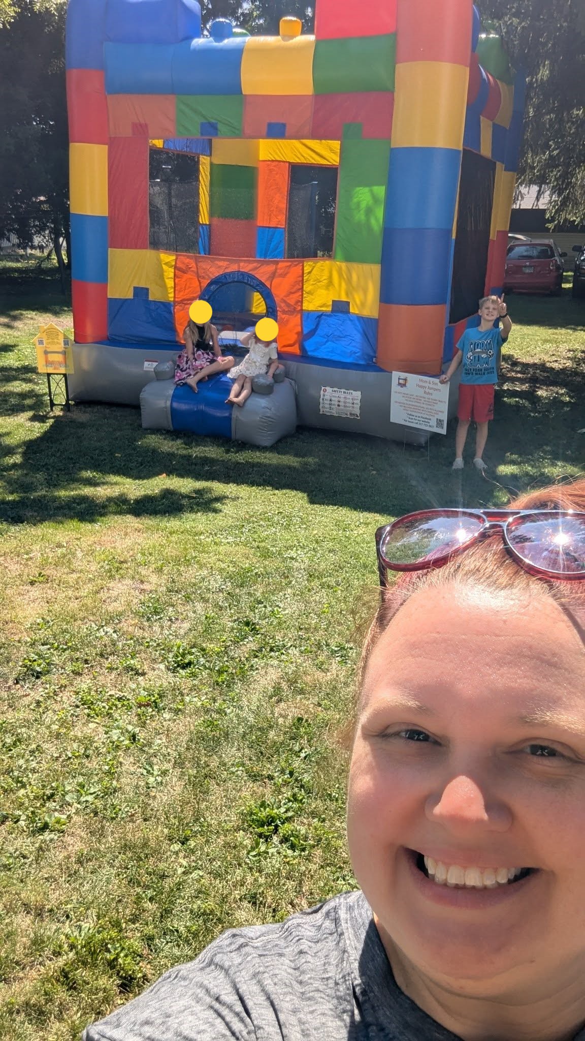 Here is a photo of a birthday party in Westville. These kiddos were very excited to have this Lego jumper at their party!